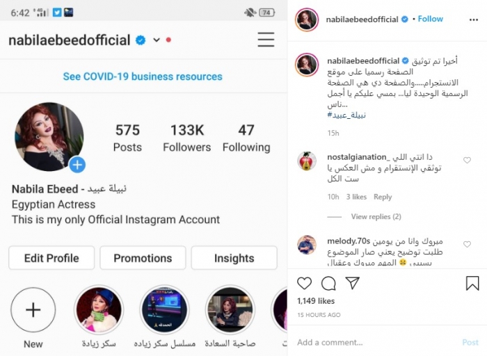 ونشرت نبيلة صورة لحسابها الرسمي، وعلقت: "أخيرًا تم توثيق الصفحة رسميًا على موقع الإنستجرام... والصفحة دي هي الصفحة الرسمية الوحيدة ليا.. بمسي عليكم يا أجمل ناس".