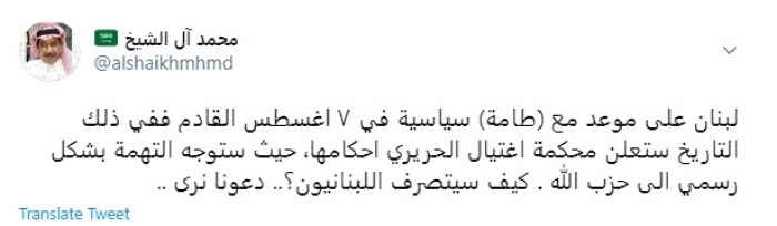 وقال في تغريدة عبر "تويتر" رصدها "المشهد العربي": "لبنان على موعد مع (طامة) سياسية في ٧ أغسطس القادم ففي ذلك التاريخ ستعلن محكمة اغتيال الحريري أحكامها، حيث ستوجه التهمة بشكل رسمي إلى حزب الله . كيف سيتصرف اللبنانيون؟.. دعونا نرى".