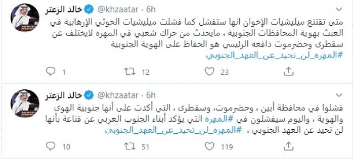 وكتب في تغريدات عبر "تويتر" رصدها "المشهد العربي": "فشلوا في محافظة أبين، وحضرموت، وسقطرى، التي أكدت على أنها جنوبية الهوى والهوية، واليوم سيفشلون في المهرة التي يؤكد أبناء الجنوب العربي عن قناعة بأنها لن تحيد عن العهد الجنوبي".