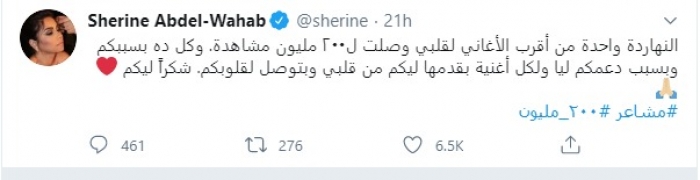 وكتبت شيرين عبر حسابها على تويتر: "النهاردة واحدة من أقرب الأغاني لقلبي وصلت لـ200 مليون مشاهدة. وكل ده بسببكم وبسبب دعمكم ليا ولكل أغنية بقدمها ليكم من قلبي وبتوصل لقلوبكم. شكراً ليكم، مشاعر".