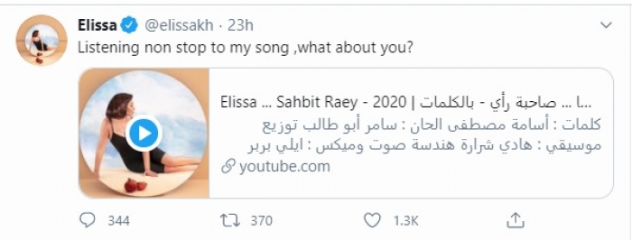 نشرت الفنانة اللبنانية إليسا رابط أغنيتها الجديدة "صاحبة رأي"، عبر حسابها على تويتر.