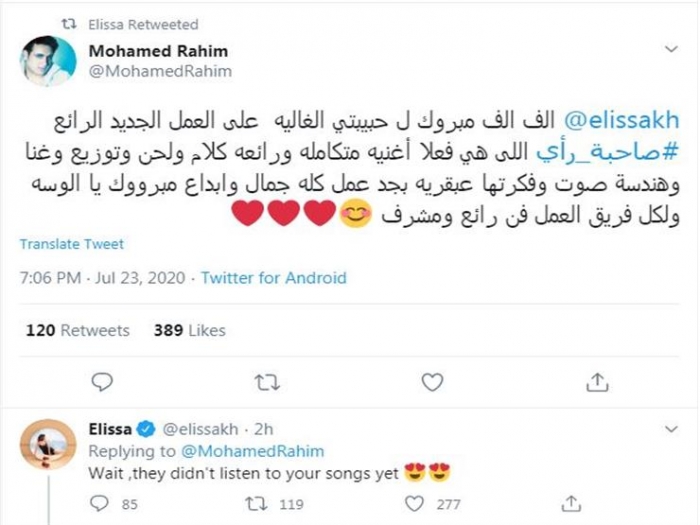 وعلقت إليسا على كلمات رحيم، وكتبت :"انتظر هم لم يستمعوا بعد لأغانيك"، أغنية "صاحبة رأي" كلمات أسامة مصطفى، ألحان سامر أبو طالب، توزيع هادي شرارة.