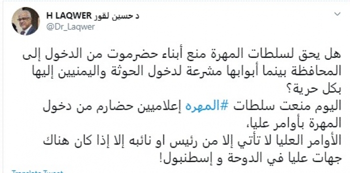 وقال في تغريدة عبر "تويتر" رصدها "المشهد العربي": "هل يحق لسلطات المهرة منع أبناء حضرموت من الدخول إلى المحافظة بينما أبوابها مشرعة لدخول الحوثة واليمنيين إليها بكل حرية؟".