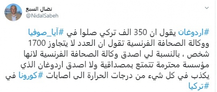 وقال في تغريدة عبر "تويتر" رصدها "المشهد العربي": "أردوغان يقول أن 350 ألف تركي صلوا في آيا صوفيا ووكالة الصحافة الفرنسية تقول أن العدد لا يتجاوز 1700 شخص".