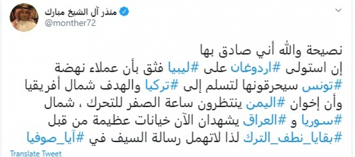 وقال في تغريدة عبر "تويتر" رصدها "المشهد العربي": "نصيحة والله أني صادق بها إن استولى أردوغان على ليبيا فثق بأن عملاء نهضة تونس سيحرقونها لتسلم إلى تركيا والهدف شمال أفريقيا".