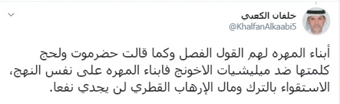 وكتب عبر تغريدة له على "تويتر" رصدها "المشهد العربي": "أبناء المهرة لهم القول الفصل وكما قالت حضرموت ولحج كلمتها ضد مليشيات الإخونج فأبناء المهرة على نفس النهج، الاستقواء بالترك ومال الإرهاب القطري لن يجدي نفعا".