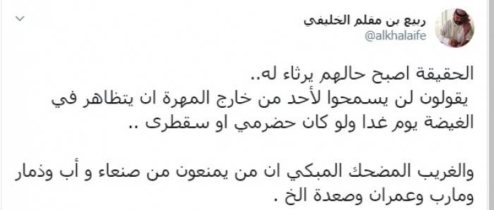 وكتب عبر تغريدة له على "تويتر" رصدها "المشهد العربي": "الحقيقة أصبح حالهم يرثى له، يقولون لن يسمحوا لأحد من خارج المهرة أن يتظاهر في الغيضة يوم غد ولو كان حضرميا أو سقطريا، والغريب المضحك المبكي أن من يمنعون من صنعاء وأب وذمار ومأرب وعمران وصعدة إلخ ".