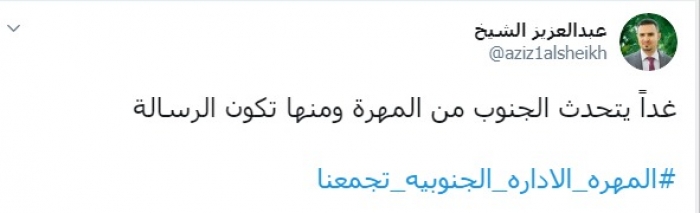 وكتب عبر تغريدة له على "تويتر" رصدها "المشهد العربي": "غدًا يتحدث الجنوب من المهرة ومنها تكون الرسالة".