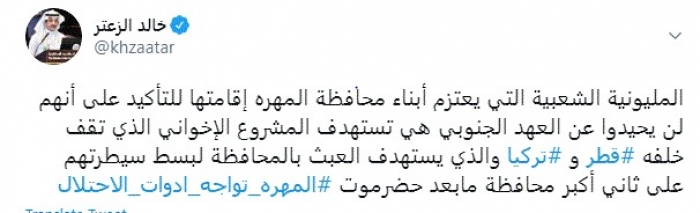 الزعتر: مليونية المهرة تستهدف المشروع الإخواني الذي يقف خلفه قطر وتركيا