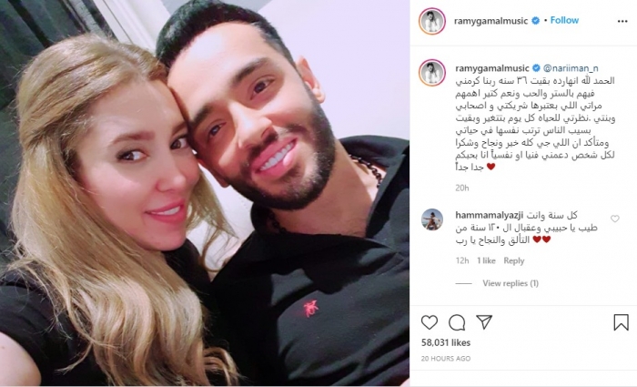 ونشر رامي صورة تجمعه بزوجته ناريمان، عبر حسابه الرسمي بموقع "إنستجرام"، وعلق :" الحمد لله انهارده بقيت ٣٦ سنة ربنا كرمني فيهم بالستر والحب ونعم كتير أهمهم مراتي اللي بعتبرها شريكتي وأصحابي وبنتي ، نظرتي للحياه كل يوم بتتغير وبقيت بسيب الناس ترتب نفسها في حياتي ومتأكد أن اللي جي كله خير ونجاح وشكرا لكل شخص دعمني فنيا أو نفسياً انا بحبكم جدا جداً".