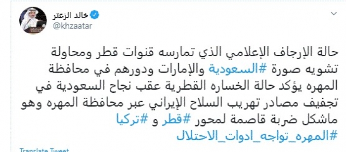 وكتب في تغريدة عبر "تويتر" رصدها "المشهد العربي": "حالة الإرجاف الإعلامي الذي تمارسه قنوات قطر ومحاولة تشويه صورة السعودية والإمارات ودورهم في محافظة المهرة".