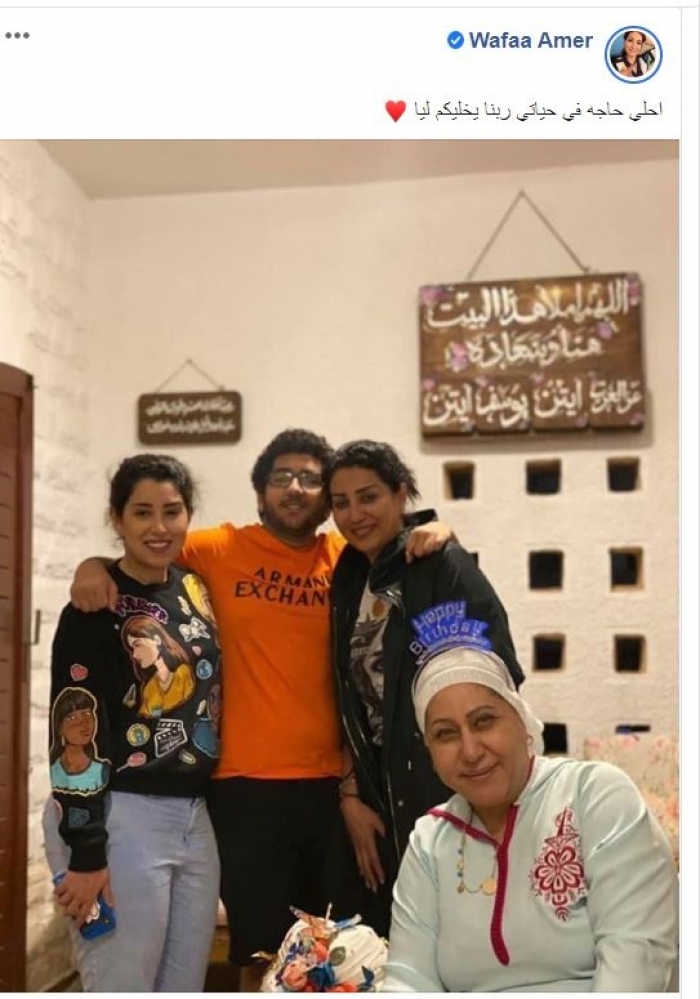 وظهر في الصورة كل من والدة الفنانة وفاء عامر ونجلها عمر وشقيقتها أيتن عامر، وعلقت :"أحلى حاجة في حياتي، ربنا يخليكم ليا".