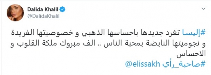 وكتبت داليدا، عبر حسابها على تويتر، قائلة: "إليسا تغرد جديدها بإحساسها الذهبي وخصوصيتها الفريدة ونجوميتها النابضة بمحبة الناس .. ألف مبروك ملكة القلوب والإحساس.. صاحبة رأي".