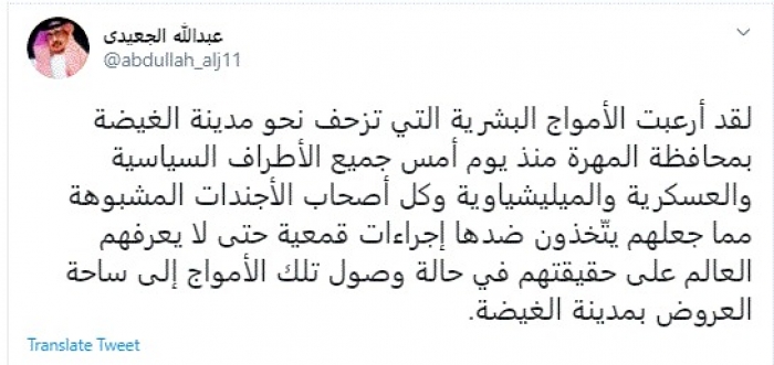 وكتب في تغريدة عبر "تويتر" رصدها "المشهد العربي": "لقد أرعبت الأمواج البشرية التي تزحف نحو مدينة الغيضة بمحافظة المهرة منذ يوم أمس جميع الأطراف السياسية والعسكرية والمليشياوية وكل أصحاب الأجندات المشبوهة".