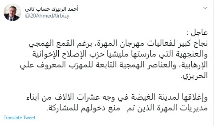 وكتب في تغريدة عبر "تويتر" رصدها "المشهد العربي": "نجاح كبير لفعاليات مهرجان المهرة، برغم القمع الهمجي والعنجهية التي مارستها مليشيا حزب الإصلاح الإخوانية الإرهابية، والعناصر الهمجية التابعة للمهرّب المعروف علي الحريزي".
