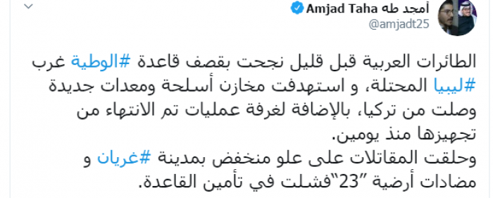 وكتب عبر تغريدة له على "تويتر" رصدها " المشهد العربي": "الطائرات العربية قبل قليل نجحت بقصف قاعدة الوطية غرب ليبيا المحتلة، و استهدفت مخازن أسلحة ومعدات جديدة وصلت من تركيا، بالإضافة لغرفة عمليات تم الانتهاء من تجهيزها منذ يومين، وحلقت المقاتلات على علو منخفض بمدينة غريان و مضادات أرضية "23" فشلت في تأمين القاعدة".