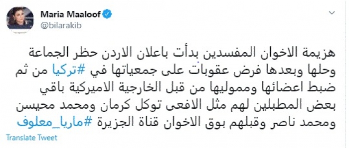 علقت الإعلامية اللبنانية ماريا معلوف، اليوم، على محاصرة الأردن لجماعة الإخوان هُناك، مؤكدةً أن هزيمة الإخوان بدأت في الأردن وبعدها تم فرض عقوبات على جمعيات تابعة للجماعة في تركيا، واصفةً في الوقت ذاته القيادية الإخوانية المدعوة توكل كرمان بالأفعى.