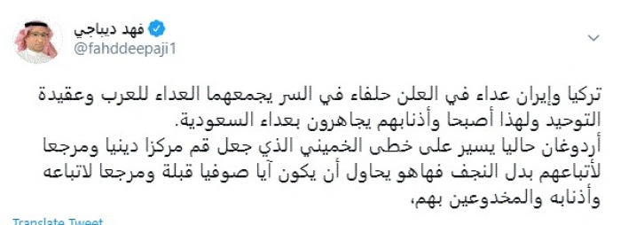 وقال في تغريدة عبر "تويتر" رصدها "المشهد العربي": "تركيا وإيران عداء في العلن حلفاء في السر يجمعهما العداء للعرب وعقيدة التوحيد ولهذا أصبحا وأذنابهم يجاهرون بعداء السعودية".
