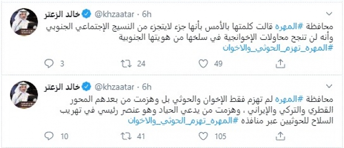 وكتب في تغريدات عبر "تويتر" رصدها "المشهد العربي": "محافظة المهرة لم تهزم فقط الإخوان والحوثي بل وهزمت من بعدهم المحور القطري والتركي والإيراني، وهزمت من يدعي الحياد وهو عنصر رئيسي في تهريب السلاح للحوثيين عبر منافذه".