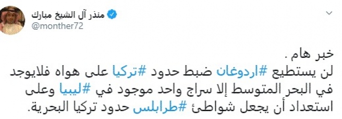 وقال في تغريدة عبر "تويتر" رصدها "المشهد العربي": "خبر هام. لن يستطيع أردوغان ضبط حدود تركيا على هواه فلا يوجد في البحر المتوسط إلا سراج واحد موجود في ليبيا وعلى استعداد أن يجعل شواطئ طرابلس حدود تركيا البحرية".