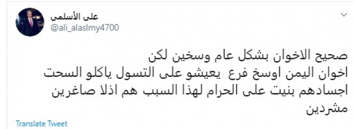 وقال في تغريدة عبر "تويتر" رصدها "المشهد العربي": "صحيح الإخوان بشكل عام .... لكن إخوان اليمن ..... فرع يعيشوا على التسول يأكلوا السحت".