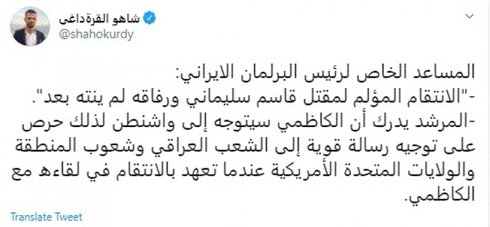 وقال في تغريدة عبر "تويتر" رصدها "المشهد العربي": "المساعد الخاص لرئيس البرلمان الايراني: - الانتقام المؤلم لمقتل قاسم سليماني ورفاقه لم ينته بعد".