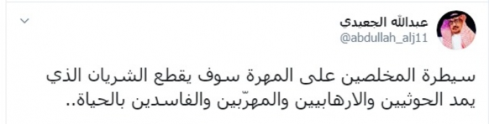 وكتب عبر تغريدة له على "تويتر" رصدها "المشهد العربي": "سيطرة المخلصين على المهرة سوف يقطع الشريان الذي يمد الحوثيين والإرهابيين والمهرّبين والفاسدين بالحياة".