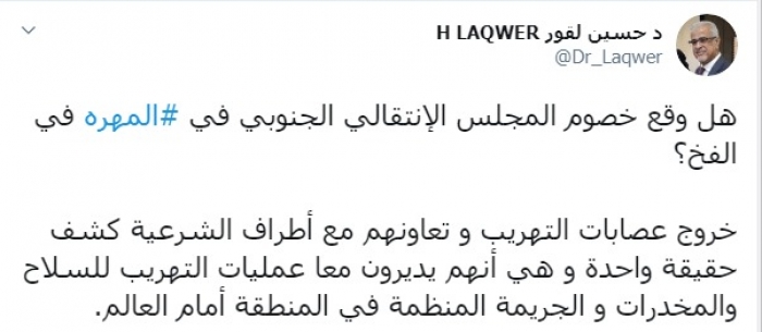 وكتب عبر تغريدة له على "تويتر" رصدها "المشهد العربي": "هل وقع خصوم المجلس الانتقالي الجنوبي في المهرة في الفخ، خروج عصابات التهريب وتعاونهم مع أطراف الشرعية كشف حقيقة واحدة وهي أنهم يديرون معا عمليات التهريب للسلاح والمخدرات والجريمة المنظمة في المنطقة أمام العالم".