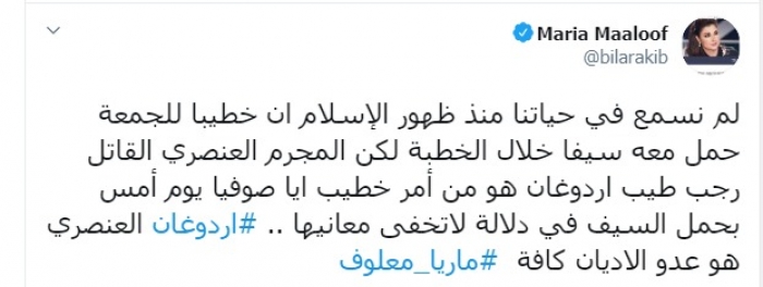هاجمت الإعلامية اللبنانية ماريا معلوف، اليوم الأحد، رئيس النظام التركي رجب طيب أردوغان، مؤكدة أنه عنصري وعدو للأديان كافة.