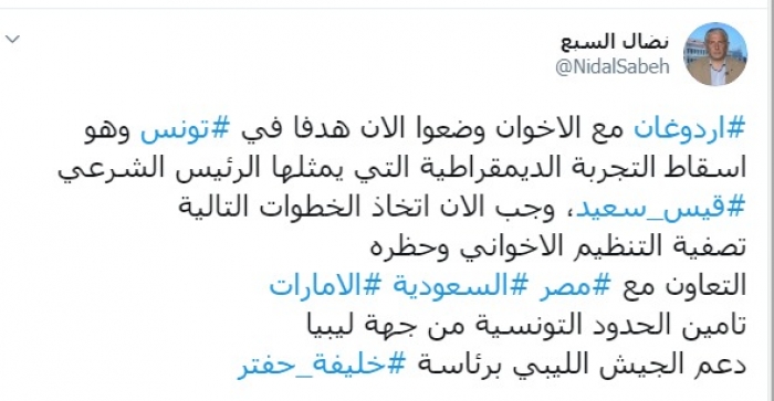 وكتب عبر تغريدة له على "تويتر" رصدها " المشهد العربي": "أردوغان مع الإخوان وضعوا الآن هدفا في تونس وهو إسقاط التجربة الديمقراطية التي يمثلها الرئيس الشرعي قيس سعيد، وجب الآن اتخاذ الخطوات التالية، تصفية التنظيم الإخواني وحظره، التعاون مع مصر والسعودية والإمارات، تأمين الحدود التونسية من جهة ليبيا، دعم الجيش الليبي برئاسة خليفة حفتر".