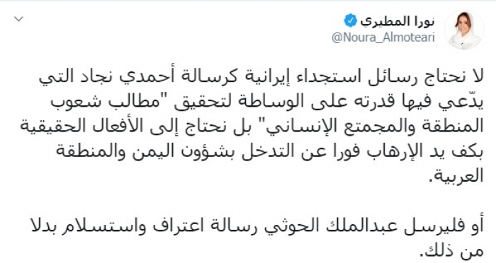 وكتبت عبر تغريدة لها على "تويتر" رصدها "المشهد العربي": "لا نحتاج رسائل استجداء إيرانية كرسالة أحمدي نجاد التي يدّعي فيها قدرته على الوساطة لتحقيق "مطالب شعوب المنطقة والمجتمع الإنساني" بل نحتاج إلى الأفعال الحقيقية بكف يد الإرهاب فورا عن التدخل بشؤون اليمن والمنطقة العربية".