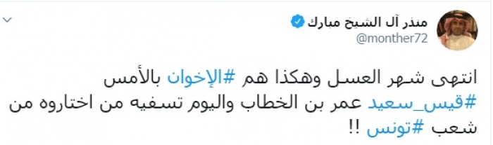 وكتب عبر تغريدة له على "تويتر" رصدها " المشهد العربي":"انتهى شهر العسل وهكذا هم الإخوان بالأمس قيس سعيد عمر بن الخطاب واليوم تسفيه من اختاروه من شعب تونس".