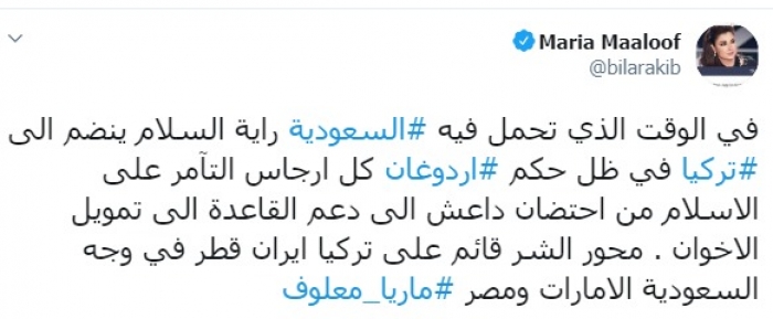 وكتبت عبر تغريدة لها على "تويتر" رصدها " المشهد العربي": "في الوقت الذي تحمل فيه السعودية راية السلام ينضم إلى تركيا في ظل حكم أردوغان كل أرجاس التآمر على الإسلام من احتضان داعش إلى دعم القاعدة إلى تمويل الإخوان، محور الشر قائم على تركيا، إيران قطر، في وجه السعودية ، الإمارات ومصر".