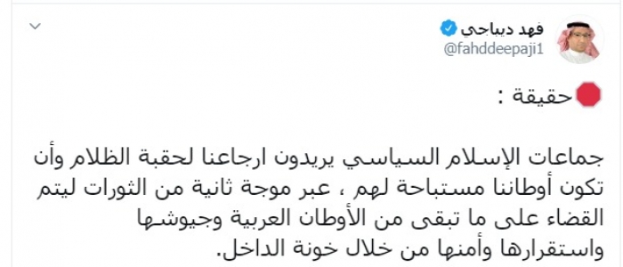 وكتب عبر تغريدة له على "تويتر" رصدها " المشهد العربي":"حقيقة، جماعات الإسلام السياسي يريدون إرجاعنا لحقبة الظلام وأن تكون أوطاننا مستباحة لهم، عبر موجة ثانية من الثورات ليتم القضاء على ما تبقى من الأوطان العربية وجيوشها واستقرارها وأمنها من خلال خونة الداخل".