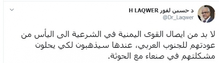 وكتب عبر تغريدة له على "تويتر" رصدها "المشهد العربي": "لا بد من إيصال القوى اليمنية في الشرعية إلى اليأس من عودتهم للجنوب العربي، عندها سيذهبون لكي يحلون مشكلتهم في صنعاء مع الحوثة".