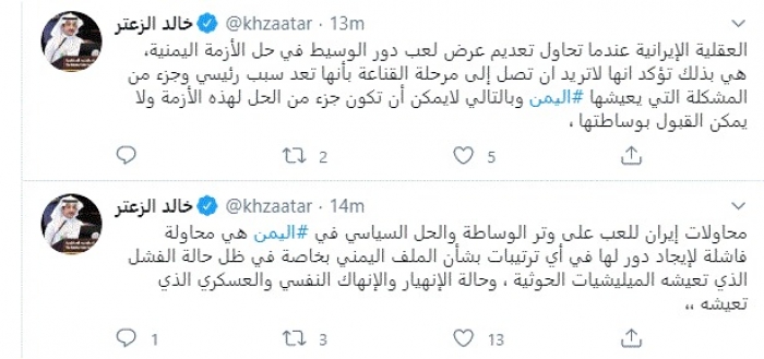 وقال في تغريدات عبر "تويتر" رصدها "المشهد العربي": "محاولات إيران للعب على وتر الوساطة والحل السياسي في اليمن هي محاولة فاشلة لإيجاد دور لها في أي ترتيبات بشأن الملف اليمني بخاصة في ظل حالة الفشل الذي تعيشه المليشيات الحوثية، وحالة الانهيار والإنهاك النفسي والعسكري الذي تعيشه".