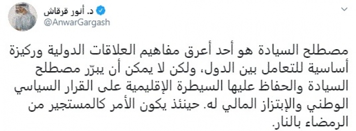 وكتب في تغريدة عبر "تويتر" رصدها "المشهد العربي": "مصطلح السيادة هو أحد أعرق مفاهيم العلاقات الدولية وركيزة أساسية للتعامل بين الدول، ولكن لا يمكن أن يبرّر مصطلح السيادة والحفاظ عليها السيطرة الإقليمية على القرار السياسي الوطني والإبتزاز المالي له. حينئذ يكون الأمر كالمستجير من الرمضاء بالنار".