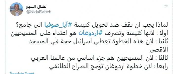 وأضاف: "لأن هذه الخطوة تعطي إسرائيل حجة في المسجد الأقصى. لأن المسيحيين هم جزء أساسي من عالمنا العربي.. لأن خطوة أردوغان تؤجج الصراع الطائفي".