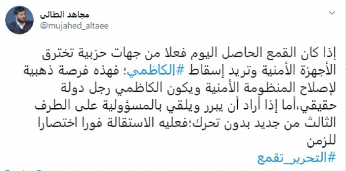 وقال في تغريدة عبر "تويتر" رصدها "المشهد العربي": "إذا كان القمع الحاصل اليوم فعلا من جهات حزبية تخترق الأجهزة الأمنية وتريد إسقاط الكاظمي؛ فهذه فرصة ذهبية لإصلاح المنظومة الأمنية ويكون الكاظمي رجل دولة حقيقي".