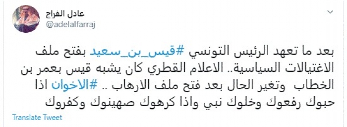 وقال في تغريدة عبر "تويتر" رصدها "المشهد العربي": "بعد ما تعهد الرئيس التونسي قيس بن سعيد بفتح ملف الاغتيالات السياسية.. الإعلام القطري كان يشبه قيس بعمر بن الخطاب وتغير الحال بعد فتح ملف الإرهاب".