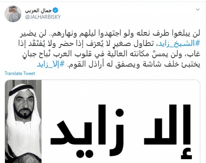 الحربي لـ الإخوان: نباحكم لن يمس مكانة الشيخ زايد في قلوب العرب