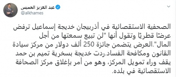 وقال في تغريدة عبر "تويتر" رصدها "المشهد العربي": "الصحفية الاستقصائية في أذربيجان خديجة إسماعيل ترفض عرضًا قطريًا وتقول أنها لن تبيع سمعتها من أجل المال".