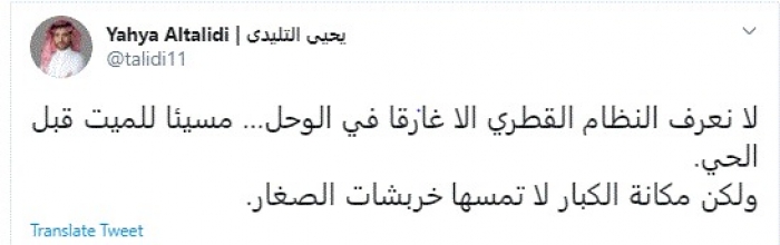 وقال في تغريدة عبر "تويتر" رصدها "المشهد العربي": "لا نعرف النظام القطري إلا غارقا في الوحل… مسيئا للميت قبل الحي".