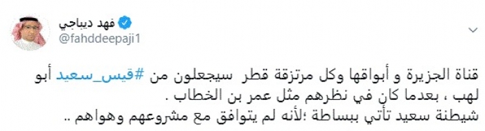 وقال في تغريدة عبر "تويتر" رصدها "المشهد العربي": "قناة الجزيرة و أبواقها وكل مرتزقة قطر سيجعلون من قيس سعيد أبو لهب، بعدما كان في نظرهم مثل عمر بن الخطاب".