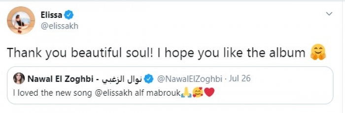 وكانت نوال الزغبي، كتبت في تغريدة سابقة: "أحببت الأغنية الجديدة إليسا.. ألف مبروك".