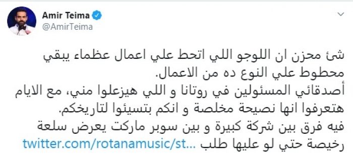 وأضاف: "أصدقائي المسئولين في روتانا واللي هيزعلوا مني، مع الأيام هتعرفوا إنها نصيحة مخلصة وإنكم بتسيئوا لتاريخكم، فيه فرق بين شركة كبيرة وبين سوبر ماركت يعرض سلعة رخيصة حتى لو عليها طلب".