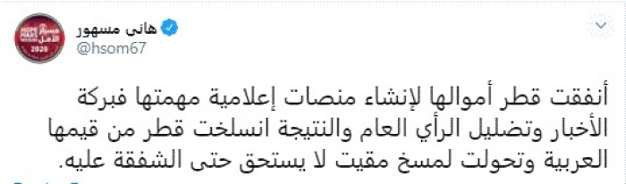 وقال في تغريدة عبر "تويتر" رصدها "المشهد العربي": "أنفقت قطر أموالها لإنشاء منصات إعلامية مهمتها فبركة الأخبار وتضليل الرأي العام والنتيجة انسلخت قطر من قيمها العربية وتحولت لمسخ مقيت لا يستحق حتى الشفقة عليه".