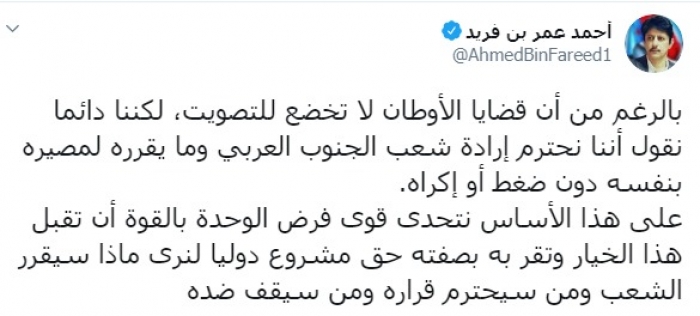 وكتب عبر تغريدة له على "تويتر" رصدها " المشهد العربي": "بالرغم من أن قضايا الأوطان لا تخضع للتصويت، لكننا دائما نقول أننا نحترم إرادة شعب الجنوب العربي وما يقرره لمصيره بنفسه دون ضغط أو إكراه، على هذا الأساس نتحدى قوى فرض الوحدة بالقوة أن تقبل هذا الخيار وتقر به بصفته حق مشروع دوليا لنرى ماذا سيقرر الشعب ومن سيحترم قراره ومن سيقف ضده".