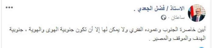 وكتب عبر تغريدة له على "تويتر" رصدها " المشهد العربي" :"أبين خاصرة الجنوب وعموده الفقري ولا يمكن لها إلا أن تكون جنوبية الهوى والهوية ، جنوبية الهدف والموقف والمصير" .