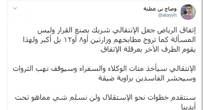 وكتب عبر تغريدة له على "تويتر" رصدها "المشهد العربي": "اتفاق الرياض جعل الانتقالي شريكا بصنع القرار وليست المسألة كما تروج مطابخهم وزارتين أو8 أو12 بل أكبر ولهذا يقوم الطرف الآخر بعرقلة الاتفاق".